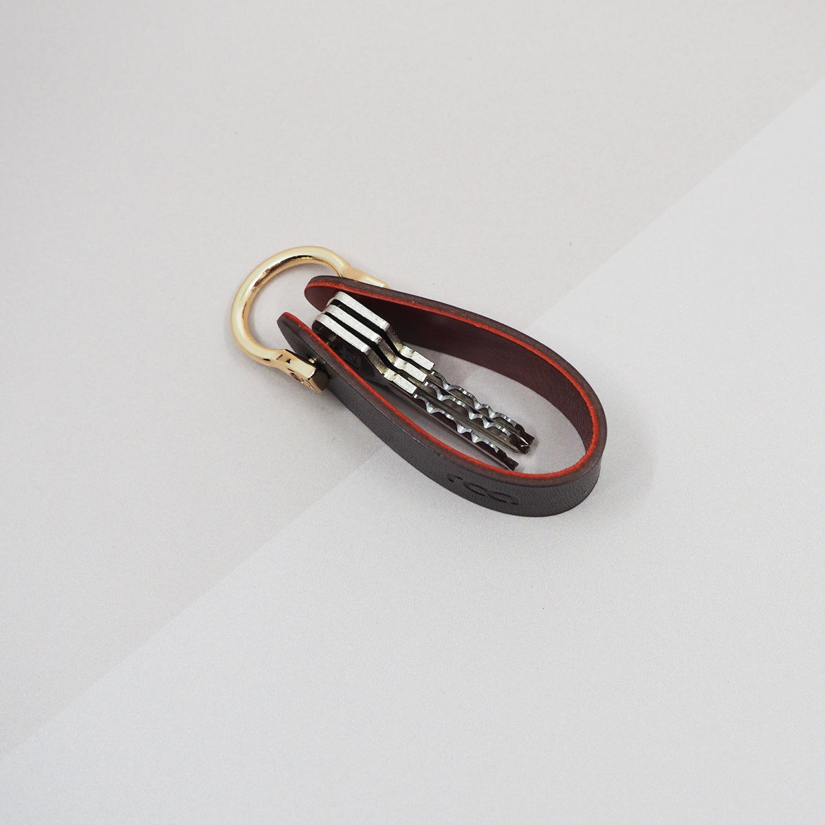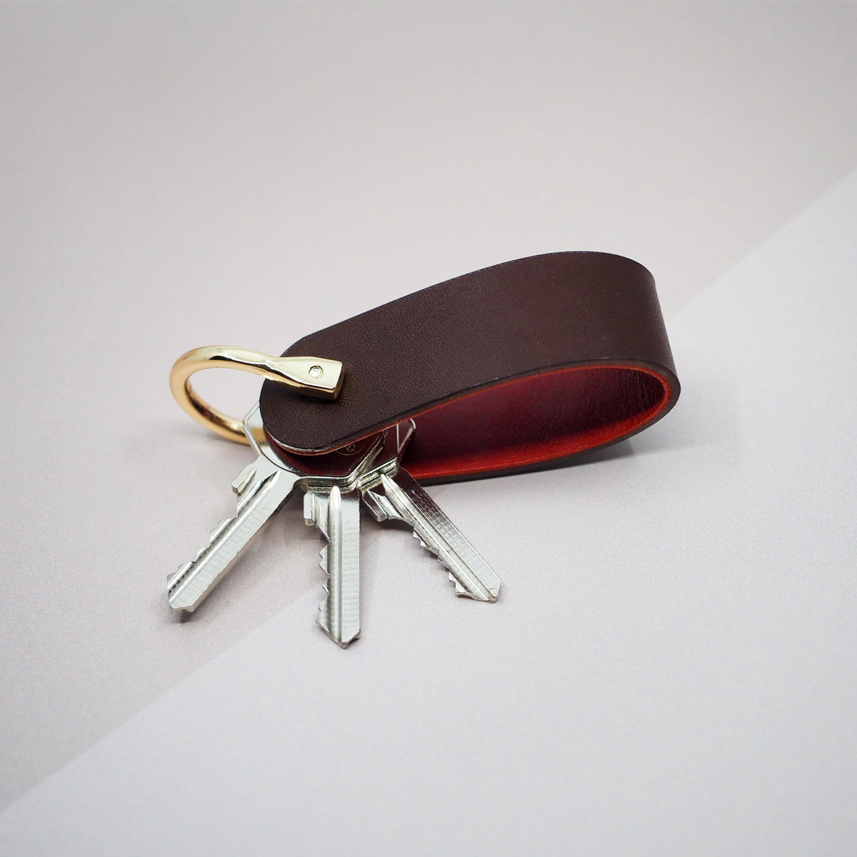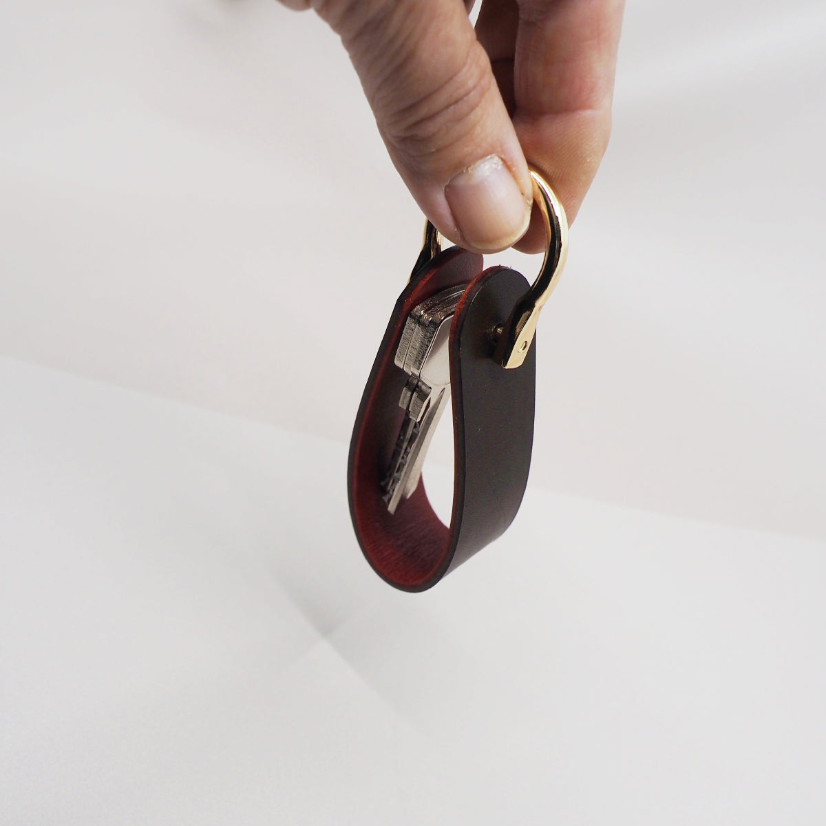 Nøkkelring i brunt/rødt skinn. Messingfarget metalldetaljer. Passer til inntil 4-5 nøkler.