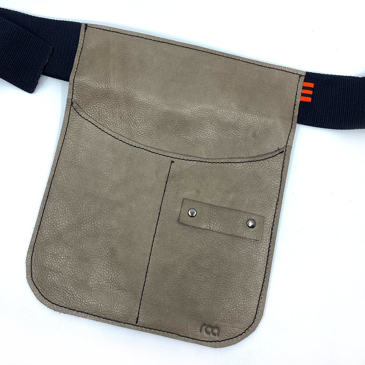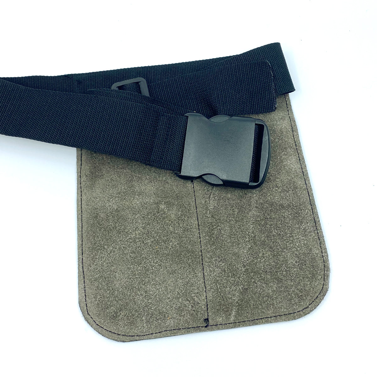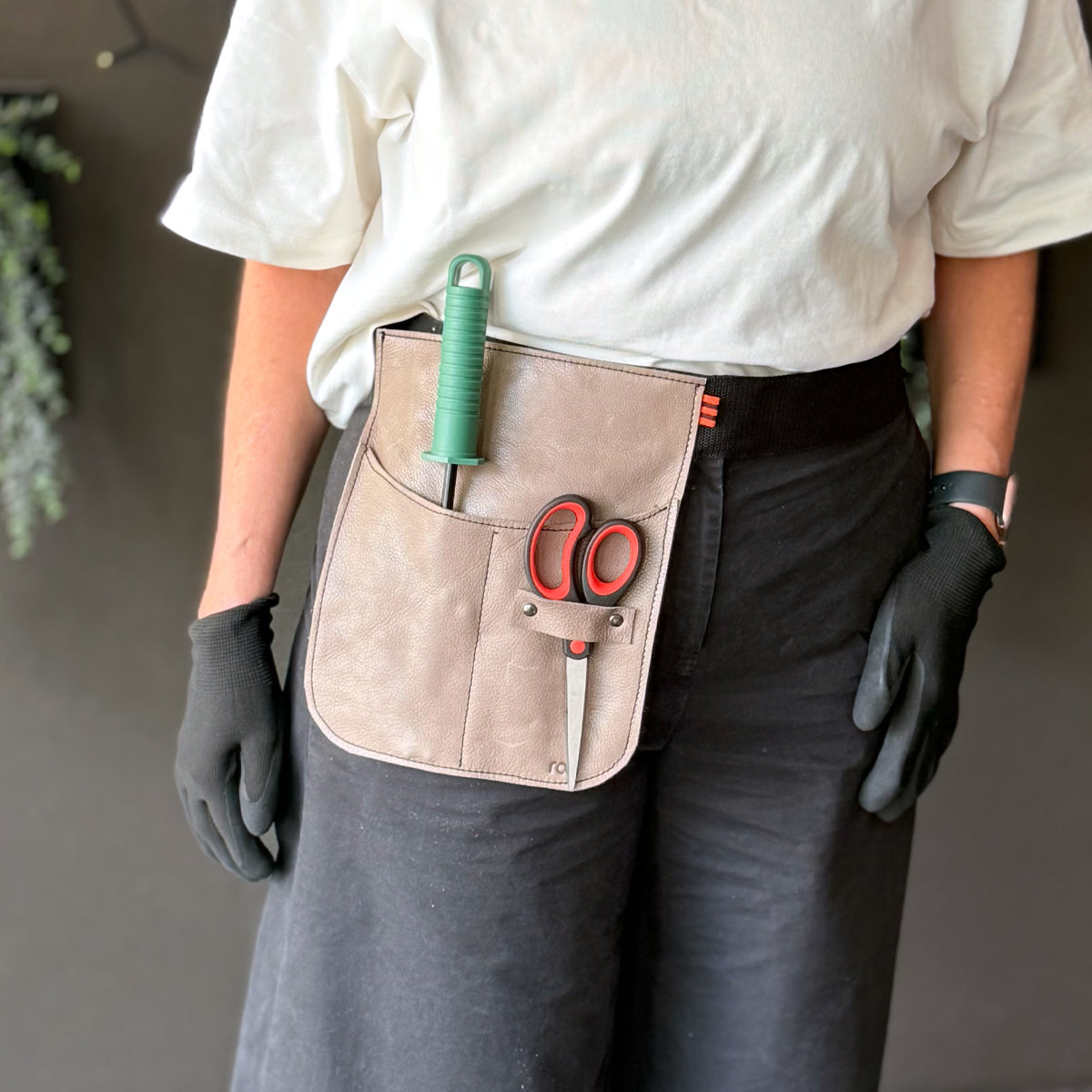 Lite, håndsydd forkle sydd i skinn. 2 lommer og en hempe til saks. Klipsbelte i nylon, 5 cm. Passer til alle størrelser. Format: 21 x 25 cm. Farge: gråbeige.