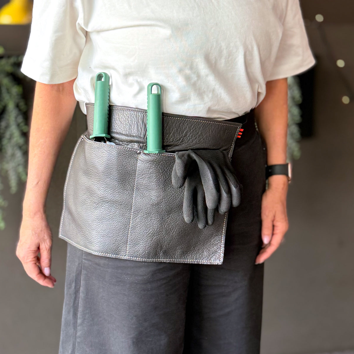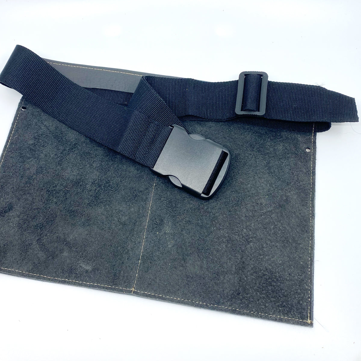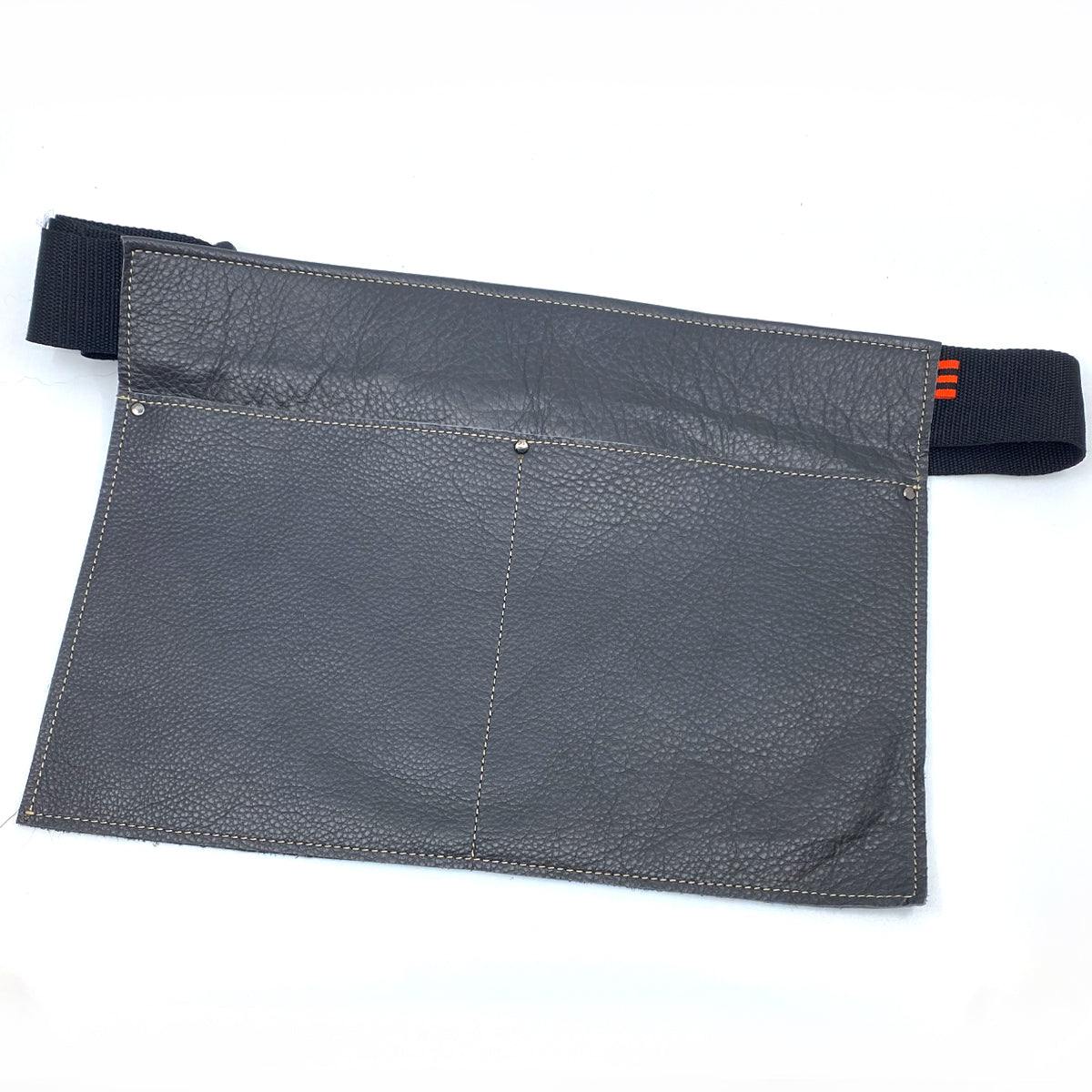 Håndsydd forkle i skinn. 2 lommer og en hempe til saks. Klipsbelte i sort nylon, 5 cm. Passer til alle størrelser. Format: 25 x 26 cm. Farge: grå.